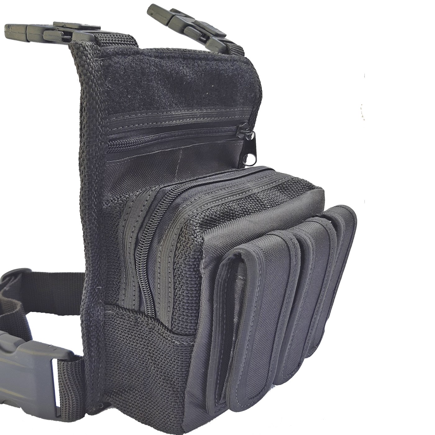 Alças de perna e alças que se prendem a qualquer cinto, com regulagem e fecho com Tic Tac;